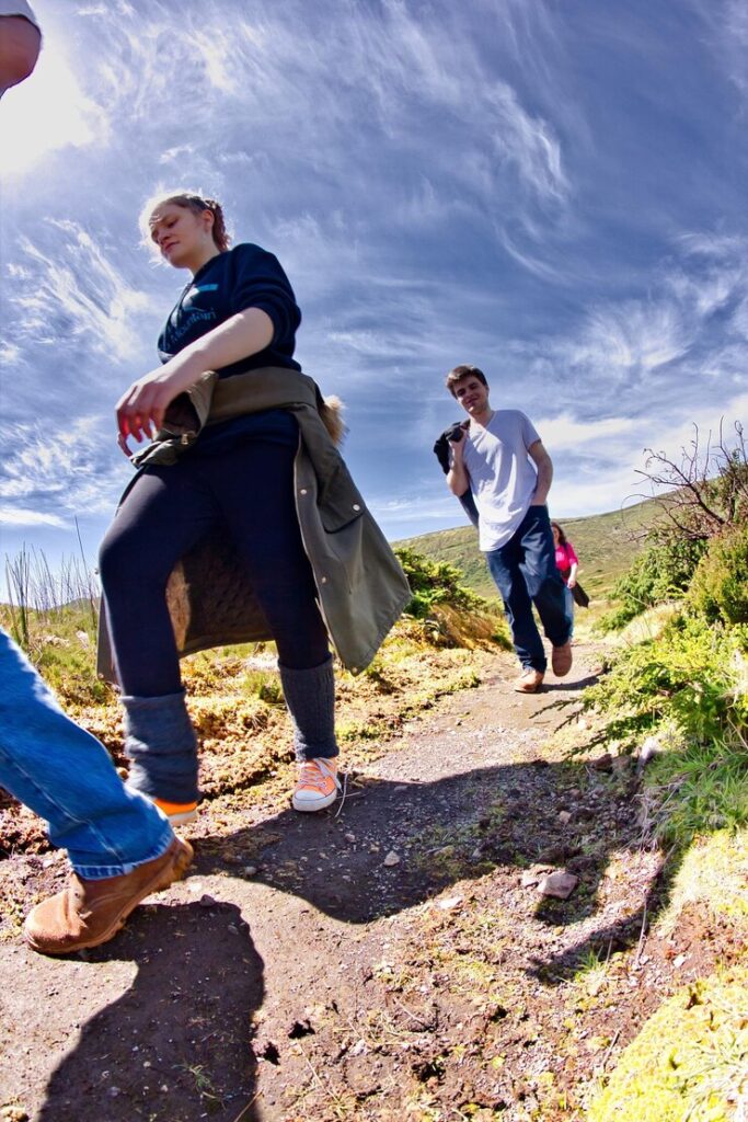Grupo de jóvenes caminando por un sendero de montaña en un día soleado, con un cielo azul lleno de nubes finas.